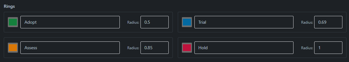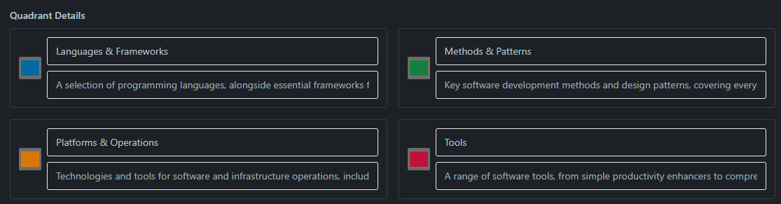 Quadrants help organize technologies into logical categories. By default, the radar includes four quadrants, but you can customize these to match your organization's needs.