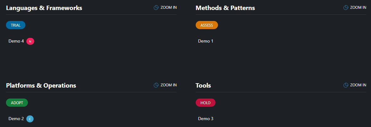 The radar visualization is the central element of the interface. It displays all technology items as blips positioned in their respective quadrants and rings.